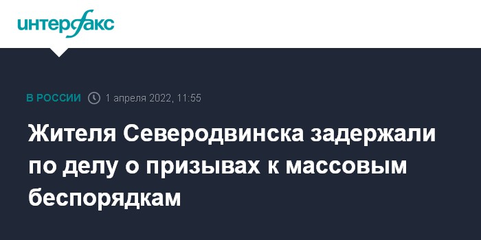 Москва. 1 апреля. INTERFAX.RU - 20-летнего жителя Северодвинска задержали по делу о призывах к массовым беспорядкам, сообщили в СК Архангельской области. Дело на него завели по материалам регионального управления ФСБ.