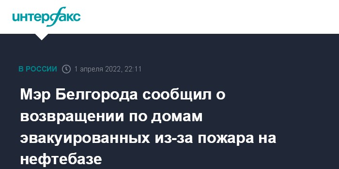 Москва. 1 апреля. INTERFAX.RU - Людей, эвакуированных с территорий, прилегающих к горящей нефтебазе в Белгороде, начали перевозить обратно по месту жительства, сообщил мэр областного центра Антон Иванов.