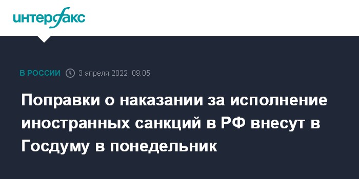 Поправки о наказании за исполнение иностранных санкций в РФ внесут в Госдуму в понедельник