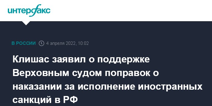 Москва. 4 апреля. INTERFAX.RU - Верховный суд поддержал поправки в закон о наказании за исполнение на территории России западных санкций. Об этом сообщил глава комитета Совета Федерации по госстроительству Андрей Клишас в своем telegram-канале.