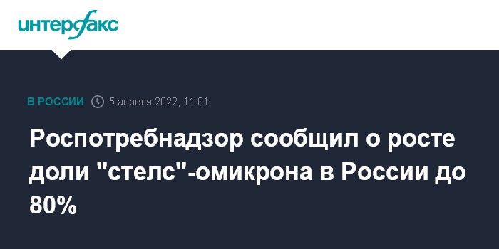 Москва. 5 апреля. INTERFAX.RU - В России за последние две недели растет доминирование подлинии BA.2 штамма "омикрон" коронавируса (так называемый "стелс-омикрон"), его доля выросла до 80%, а в целом на "омикрон" приходится 94% случаев с структуре заболеваемости, сообщили в Роспотребнадзоре.