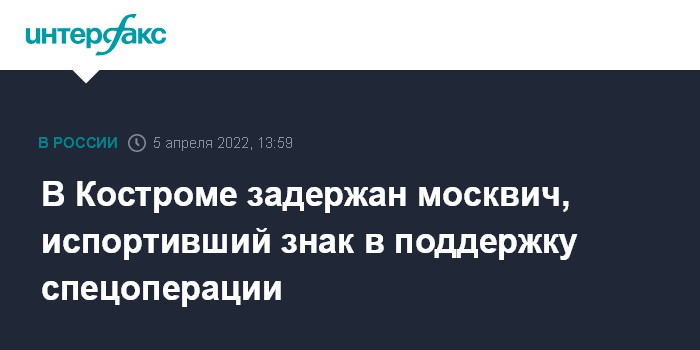 Москва. 5 апреля. INTERFAX.RU - Сотрудники полиции Костромы задержали 51-летнего жителя Москвы по подозрению в порче инсталляции в виде буквы Z, установленной в поддержку специальной военной операции РФ на Украине, сообщает УМВД по региону во вторник.