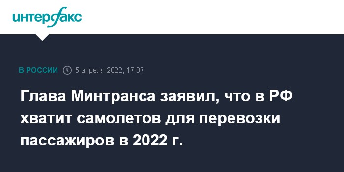 Ранее в ходе заседания глава Минтранса также сообщил, что российские авиакомпании в 2022 году смогут перевезти внутри страны 90 млн человек, за рубеж - 10 млн.
