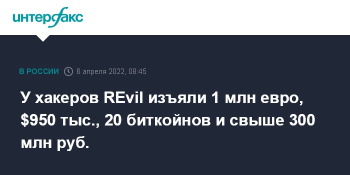 У хакеров REvil изъяли 1 млн евро, $950 тыс., 20 биткойнов и свыше 300 млн руб.
