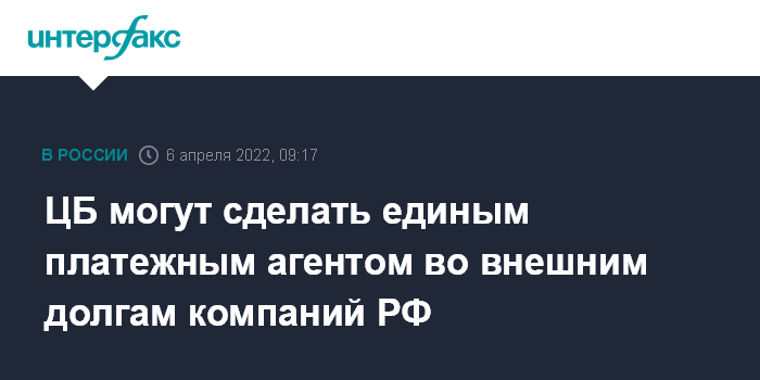Москва. 6 апреля. INTERFAX.RU - В руководстве России обсуждается возможность наделить Банк России функцией единого платежного агента по внешним обязательствам, в том числе для корпоративных эмитентов, пишут "Ведомости" со ссылкой на близкий к правительству источник.
