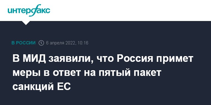 Москва. 6 апреля. INTERFAX.RU - Россия примет ответные меры на ожидаемый пятый пакет санкций ЕС, заявил замминистра иностранных дел РФ Александр Грушко.