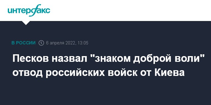Москва. 6 апреля. INTERFAX.RU - Пресс-секретарь президента России Дмитрий Песков в интервью французскому телеканалу LCI заявил, что приказ об отводе российских войск от Киева представляет собой "знак доброй воли с целью создать благоприятные условия для переговоров".