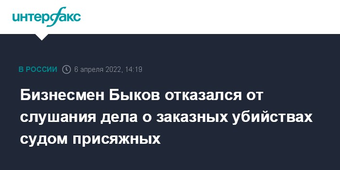 "24 марта стороной защиты в суд заявлены ходатайства, среди которых ходатайство о рассмотрении дела судом присяжных. 5 апреля на судебном заседании Быков не поддержал свое ходатайство о рассмотрении дела судом присяжным заседателей и ходатайствовал о рассмотрении уголовного дела судьей единолично. Решение по данному ходатайству судом не принято. Суд удалился на перерыв до 15 апреля", - говорится в сообщении.