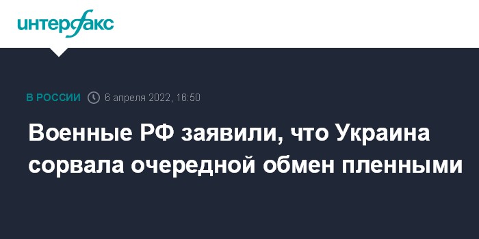 Москва. 6 апреля. INTERFAX.RU - Обмен военнопленными между РФ и Украиной в среду не состоялся, Москва готова была передать 251 человека, сообщил начальник Национального центра управления обороной Российской Федерации генерал-полковник Михаил Мизинцев.