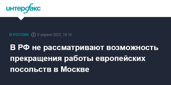 Москва. 6 апреля. INTERFAX.RU - Россия не рассматривает возможность прекращения работы европейских посольств в Москве, заявила официальный представитель МИД РФ Мария Захарова.
