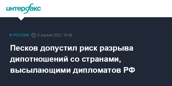 Москва. 6 апреля. INTERFAX.RU - Решения ряда европейских стран выслать российских дипломатов приводят к риску разрыва дипломатических отношения, заявил пресс-секретарь президента России Дмитрий Песков в эфире телеканала LCI.