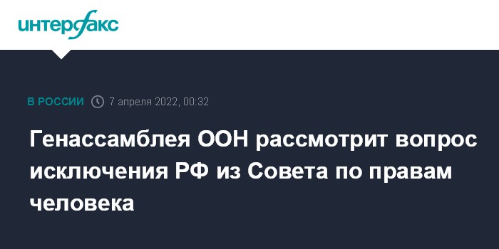 Москва. 7 апреля. INTERFAX.RU - Генеральная Ассамблея ООН в четверг рассмотрит вопрос о приостановке членства России в Совете ООН по правам человека.