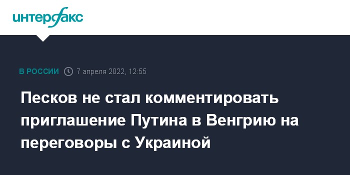 Москва. 7 апреля. INTERFAX.RU - В Кремле не стали комментировать заявление премьер-министра Венгрии Виктора Орбана, который сообщил, что пригласил президента России Владимира Путина провести переговоры с Украиной в Венгрии и получил положительный ответ на это предложение, но с определенными условиями.