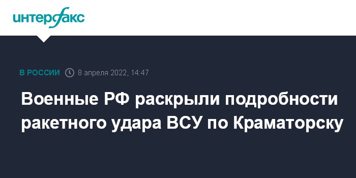 Москва. 8 апреля. INTERFAX.RU - Российские военные заявили, что установили место, откуда был нанесен удар по железнодорожному вокзалу в Краматорске.