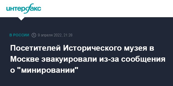 Москва. 9 апреля. INTERFAX.RU - Персонал и посетителей Государственного Исторического музея в Москве эвакуировали после сообщения о минировании здания, проводится проверка, сообщили в музее.