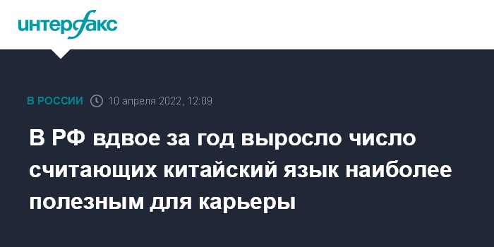 Москва. 10 апреля. INTERFAX.RU - Каждый девятый россиянин (11%) убежден, что знание китайского языка среди прочих иностранных языков наиболее важно для построения успешной карьеры, свидетельствуют данные опроса Исследовательского центра портала SuperJob.ru, поступившие в воскресенье в "Интерфакс".