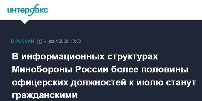 Москва. 4 июня. INTERFAX.RU - Более 50% офицерских должностей в информационных структур министерства обороны России будут переведены в разряд гражданских в рамках проходящей оптимизации Вооруженных сил, заявил официальный представитель военного ведомства.
