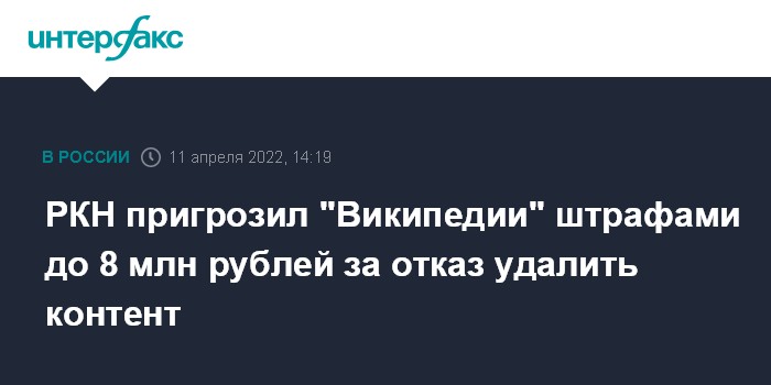 31 марта в РКН сообщили, что "в отношении интернет-портала "Википедия"" будет составлен административный протокол, по которому грозит штраф до 4 млн руб.