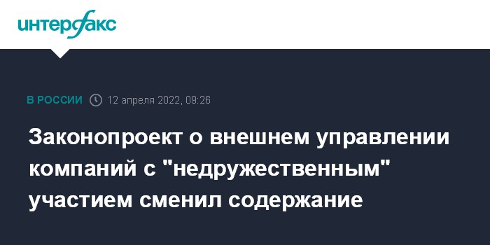 Ранее над инициативой работало Минэкономразвития. В начале марта сообщалось, что этот документ должен стать ответом российских властей на массовые заявления иностранных компаний о приостановке деятельности в России. Обнародованная на тот момент редакция проекта предусматривала введение внешнего управления в крупных компаниях с иностранным участием с обязательной дальнейшей продажей активов. Предполагалось, что такая перспектива коснется компаний, которые более чем на 25% принадлежат иностранным лицам из "недружественных государств", если они после 24 февраля 2022 года заявили о прекращении деятельности "в отсутствие для этого очевидных экономических оснований".