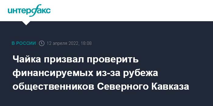 Москва. 12 апреля. INTERFAX.RU - Полпред президента в Северо-Кавказском федеральном округе Юрий Чайка предложил проверить общественные организации округа, которые получают деньги из-за рубежа. Он сказал это на заседании совета при полпреде в СКФО.