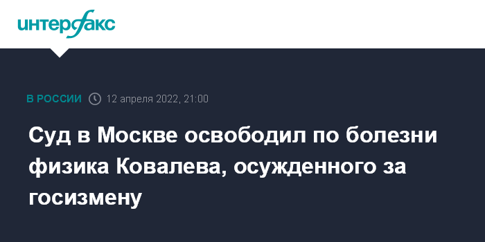 Москва. 12 апреля. INTERFAX.RU - Лефортовский суд Москвы удовлетворил ходатайство об освобождении от наказания по болезни ученого, экс-начальника Центра теплообмена и аэрогазодинамики (ЦТА) Центрального научно-исследовательского института машиностроения (ЦНИИМаш) Романа Ковалева, осужденного за государственную измену.