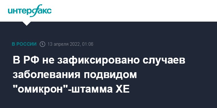 Москва. 13 апреля. INTERFAX.RU - В России в настоящее время не выявлено случаев заболевания вариантом XE - гибридом двух линий "омикрон"-штамма коронавируса, сообщил директор НИИ гриппа им. Смородинцева Минздрава России Дмитрий Лиознов.