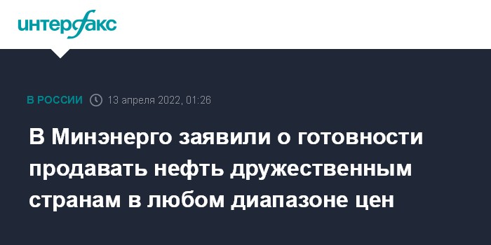 Москва. 13 апреля. INTERFAX.RU - Россия готова продавать дружественным странам нефть и нефтепродукты в любом ценовом диапазоне, заявил министр энергетики Николай Шульгинов в интервью газете "Известия".