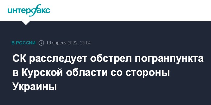 "13 апреля 2022 года произошел обстрел пограничного пункта пропуска в деревне Гордеевка Курской области со стороны Украины. Ответным огнем российских пограничников огневые точки были подавлены. Жертв и разрушений нет", - говорится в сообщении.