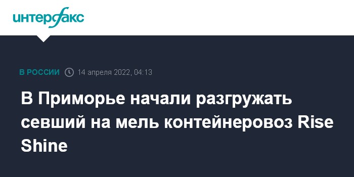 Москва. 14 апреля. INTERFAX.RU - Выгрузка контейнеров началась с севшего осенью 2021 года на мель у берегов Приморского края контейнеровоза Rise Shine (флаг Панамы), сообщила в четверг пресс-служба Находкинской таможни.