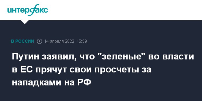 Москва. 14 апреля. INTERFAX.RU - Пришедшие к власти в Европе политики из партий экологического толка забыли о своих "зеленых" принципах и сейчас оправдывают собственные просчеты нападками на Россию, заявил президент РФ Владимир Путин на совещании о текущей ситуации в нефтегазовом секторе.