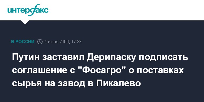 Путин заставил Дерипаску подписать соглашение с "Фосагро" о поставках сырья на завод в Пикалево