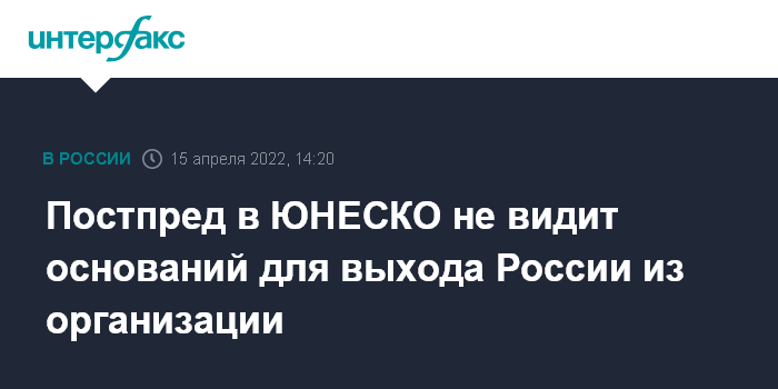 Москва. 15 апреля. INTERFAX.RU - Постоянный представитель России при ЮНЕСКО, посол Александр Кузнецов заявил на брифинге, что нет никаких оснований для выхода России из ЮНЕСКО на фоне происходящих событий.