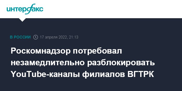 Москва. 17 апреля. INTERFAX.RU - Роскомнадзор потребовал от компании Google незамедлительно разблокировать каналы региональных филиалов ВГТРК на видеохостинге YouTube и отчитаться о причинах наложенных на них ограничений, сообщили в пресс-службе ведомства.