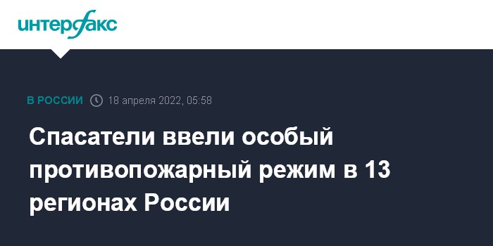 Москва. 18 апреля. INTERFAX.RU - Специалисты МЧС наблюдают за пожароопасной обстановкой в стране, уже в 13 регионах спасателями введен особый противопожарный режим, сообщили в пресс-службе министерства в понедельник.
