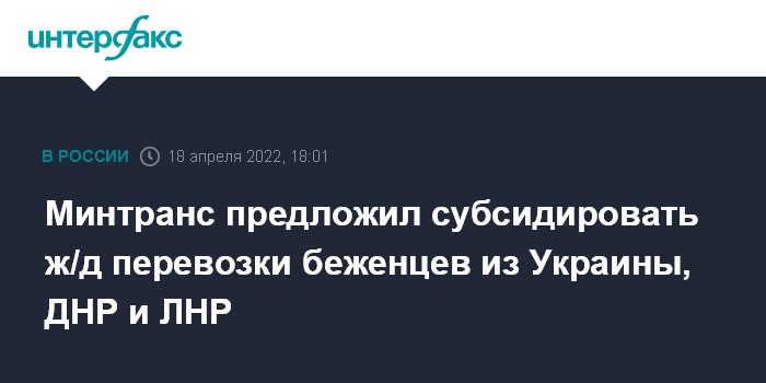 Москва. 18 апреля. INTERFAX.RU - Минтранс РФ подготовил проект постановления правительства, определяющий правила предоставления субсидий из федерального бюджета АО "Федеральная пассажирская компания" (ФПК, "дочка" ОАО "РЖД") и "Гранд Сервис Экспресс" (ГСЭ) за перевозки беженцев с территории Украины, а также Донецкой и Луганской народных республик (ДНР и ЛНР).