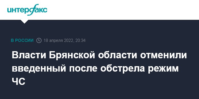 Москва. 18 апреля. INTERFAX.RU - Режим чрезвычайной ситуации, введенный в Климовском районе Брянской области после обстрела со стороны Украины, отменен, сообщает пресс-служба правительства региона в понедельник.
