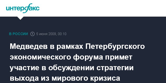 Медведев в рамках Петербургского экономического форума примет участие в обсуждении стратегии выхода из мирового кризиса