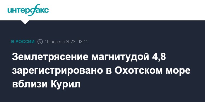 Москва. 19 апреля. INTERFAX.RU - Землетрясение магнитудой 4,8 зарегистрировано утром во вторник в Охотском море возле Курильских островов, сообщили "Интерфаксу" в Сахалинском филиале Единой геофизической службы РАН.