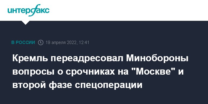 Москва. 19 апреля. INTERFAX.RU - Пресс-секретарь президента РФ Дмитрий Песков переадресовал в Минобороны вопросы, касающиеся сути второй фазы специальной военной операции на Украине и службы военнослужащих-срочников на крейсере "Москва".