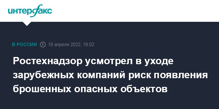 "Появился у нас новый риск, который пока не имеет некой цифровой оценки. Связан он с заявлениями ряда иностранных компаний о возможном прекращении или приостановлении деятельности в РФ. Это риск появления брошенных опасных производственных объектов", - сказал Яковлев. Пока крупные иностранные игроки уверяют, что "никто брошен не будет", но "риск такой имеется", добавил представитель Ростехнадзора.