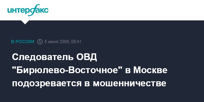 "Руководителем Следственного управления Следственного комитета при прокуратуре РФ по Москве Александром Багметом возбуждено уголовное дело по ч. 4 ст. 1590 УК РФ (мошенничество) в отношении следователя следственного отдела при ОВД "Бирюлево-Восточное", старшего лейтенанта юстиции Костикова Александра", - говорится в сообщении управления СКП РФ по Москве, поступившем в четверг в "Интерфакс".