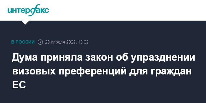 Москва. 20 апреля. INTERFAX.RU - Госдума в среду приняла закон (103295-8) об отмене ряда визовых преференций для граждан большинства стран Европы.