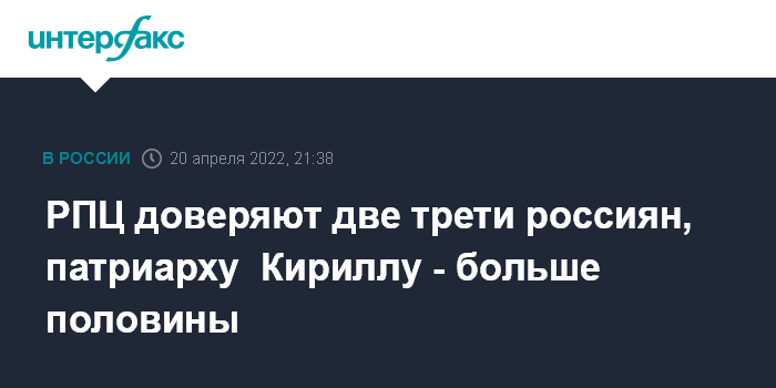 Москва. 20 апреля. INTERFAX.RU - В России Русской православной церкви доверяют 66% населения, патриарху Московскому и всея Руси Кириллу - 54%, показал поквартирный опрос фонда "Общественное мнение", проведенного 8-10 апреля в 53 регионах среди 1500 взрослых россиян.