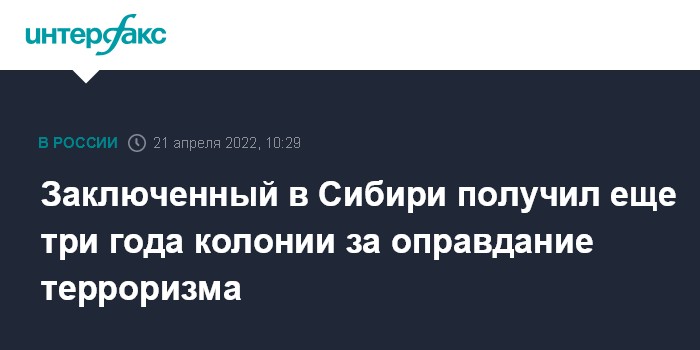 Москва. 21 апреля. INTERFAX.RU - Первый Восточный окружной военный суд признал заключенного одной из колоний Красноярского края виновным в пропаганде терроризма и приговорил его к еще трем годам колонии строгого режима,, сообщила пресс-служба управления ФСБ по региону.
