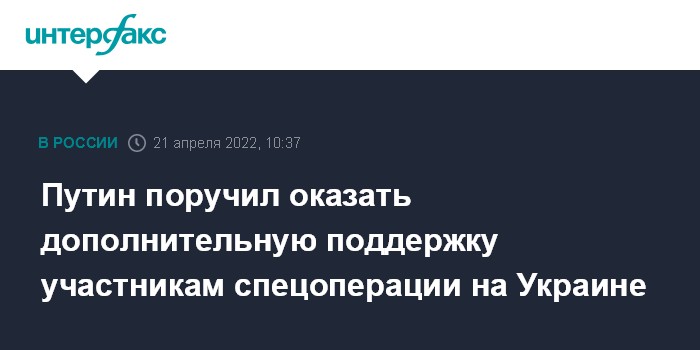 Москва. 21 апреля. INTERFAX.RU - Президент РФ Владимир Путин поручил обеспечить дополнительные меры поддержки, в том числе социальные, российским военным, участвовавшим в спецоперации на Украине.