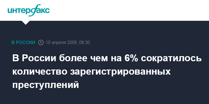 Элиста. 10 апреля. INTERFAX.RU - Общий массив зарегистрированных преступлений по итогам 2007 года в России впервые за последние пять лет сократился на 6,2%, отмечает министр внутренних дел РФ Рашид Нургалиев.