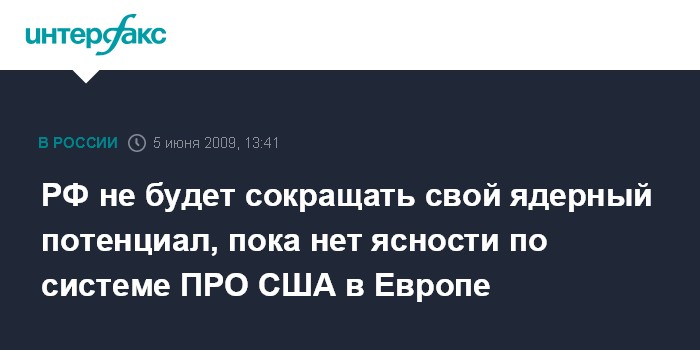 Москва. 5 июня. INTERFAX.RU - Начальник российского Генштаба генерал армии Николай Макаров заявил, что Россия не будет сокращать свой ядерный потенциал, пока сохраняется неясность в вопросе размещения третьего позиционного района ПРО США в Европе.