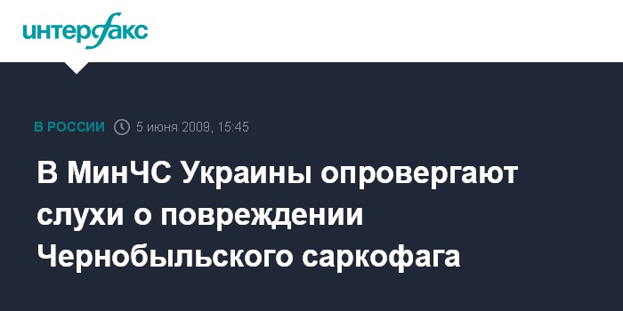 Москва. 5 июня. INTERFAX.RU - Пресс-служба МинЧС Украины опровергает слухи о якобы повреждении саркофага на Чернобыльской АЭС. Там заверили, что в последнее время никаких техногенных аварий с выбросом опасных химических веществ на территории страны не происходило.