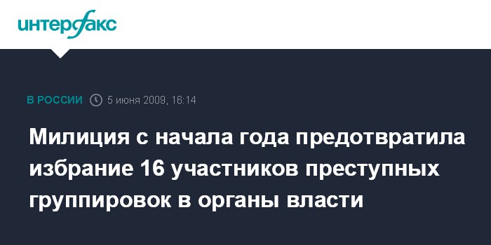 Москва. 5 июня. INTERFAX.RU - МВД России с начала нынешнего года предотвратило участие 16-ти членов преступных формирований в выборах в органы власти, сообщили в пресс-службе Департамента экономической безопасности (ДЭБ) ведомства. В пресс-релизе ДЭБ, поступившем в "Интерфакс" в пятницу, отмечается, что в рамках противодействия проникновению в органы законодательной и исполнительной власти лиц, связанных с криминальной средой, в этом году возбуждено восемь уголовных дел в отношении кандидатов в выборные органы власти субъектов РФ.