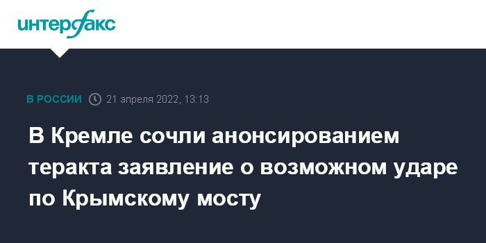 Москва. 21 апреля. INTERFAX.RU - Заявление украинской стороны о возможном ударе по Крымскому мосту является анонсированием теракта, это неприемлемо, заявил пресс-секретарь президента РФ Дмитрий Песков.